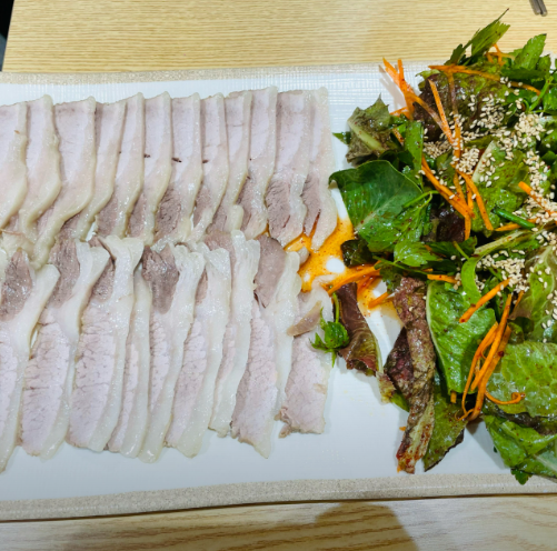 국내산 돼지고기를 부드럽게 삶아 기름기 없이 담백한 맛을 자랑하며, 기름진 냉면 육수와도 조화를 이룹니다. 특히 비계가 거의 없고 잡내도 전혀 없는 부드러운 식감은 마치 한 끼 정찬을 받은 듯한 느낌을 줍니다.